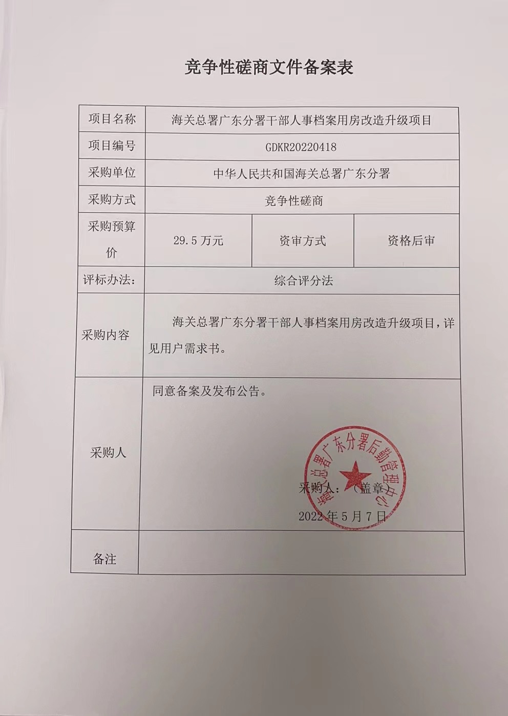 海關總署廣東分署干部人事檔案用房改造升級項目采購項目的潛在供應商應在廣州市越秀區(qū)大塘街道東風中路448號成悅大廈15H室獲取采購文件,并于 2022年5月18日14點30分(北京時間)前提交響應文件。