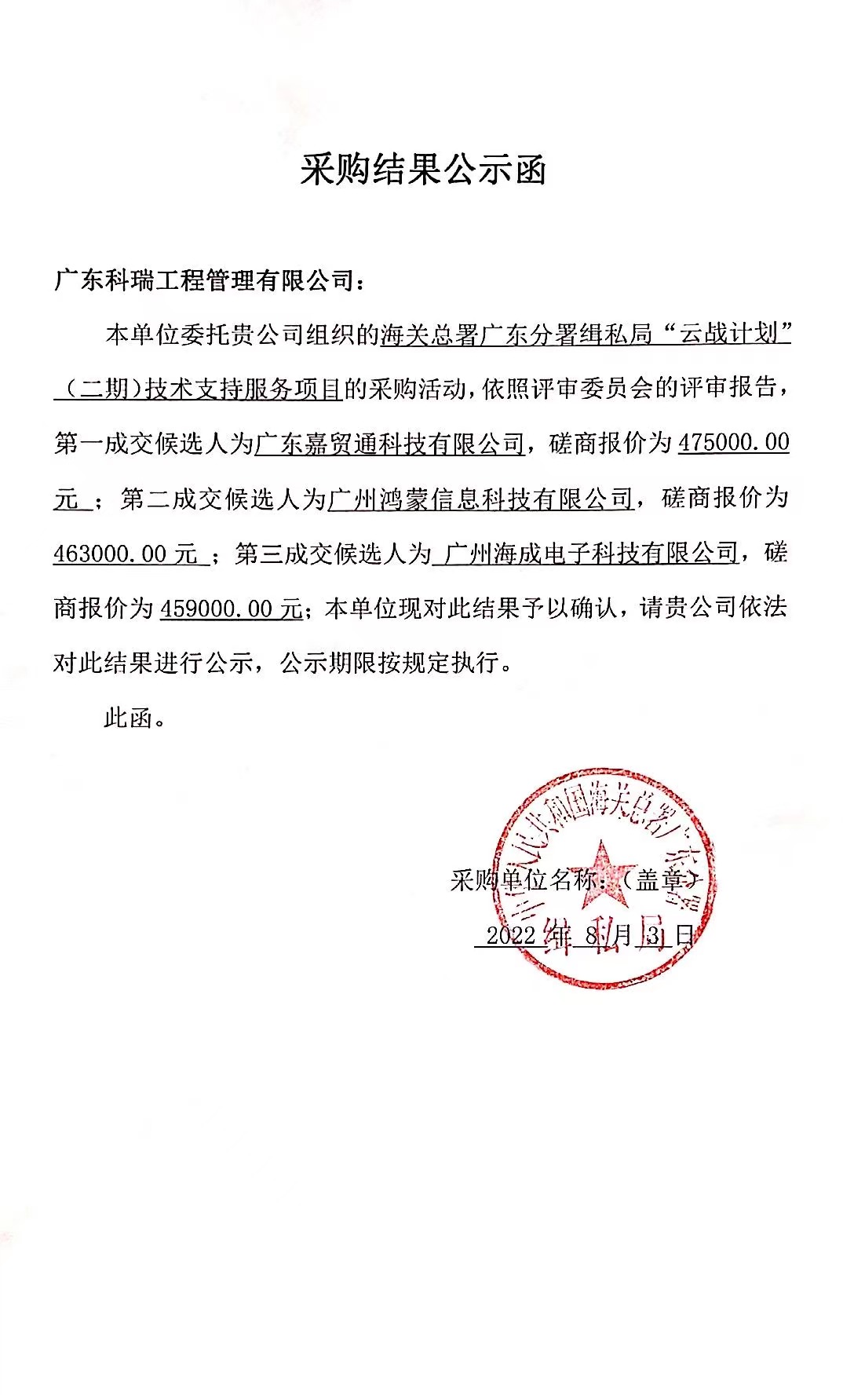廣東科瑞工程管理有限公司受中華人民共和國(guó)海關(guān)總署廣東分署緝私局的委托,于2022年7月就海關(guān)總署廣東分署緝私局“云戰(zhàn)計(jì)劃”(二期)技術(shù)支持服務(wù)項(xiàng)目競(jìng)爭(zhēng)性磋商進(jìn)行采購(gòu)?,F(xiàn)就本次采購(gòu)的中標(biāo)(成交)結(jié)果公告如下: