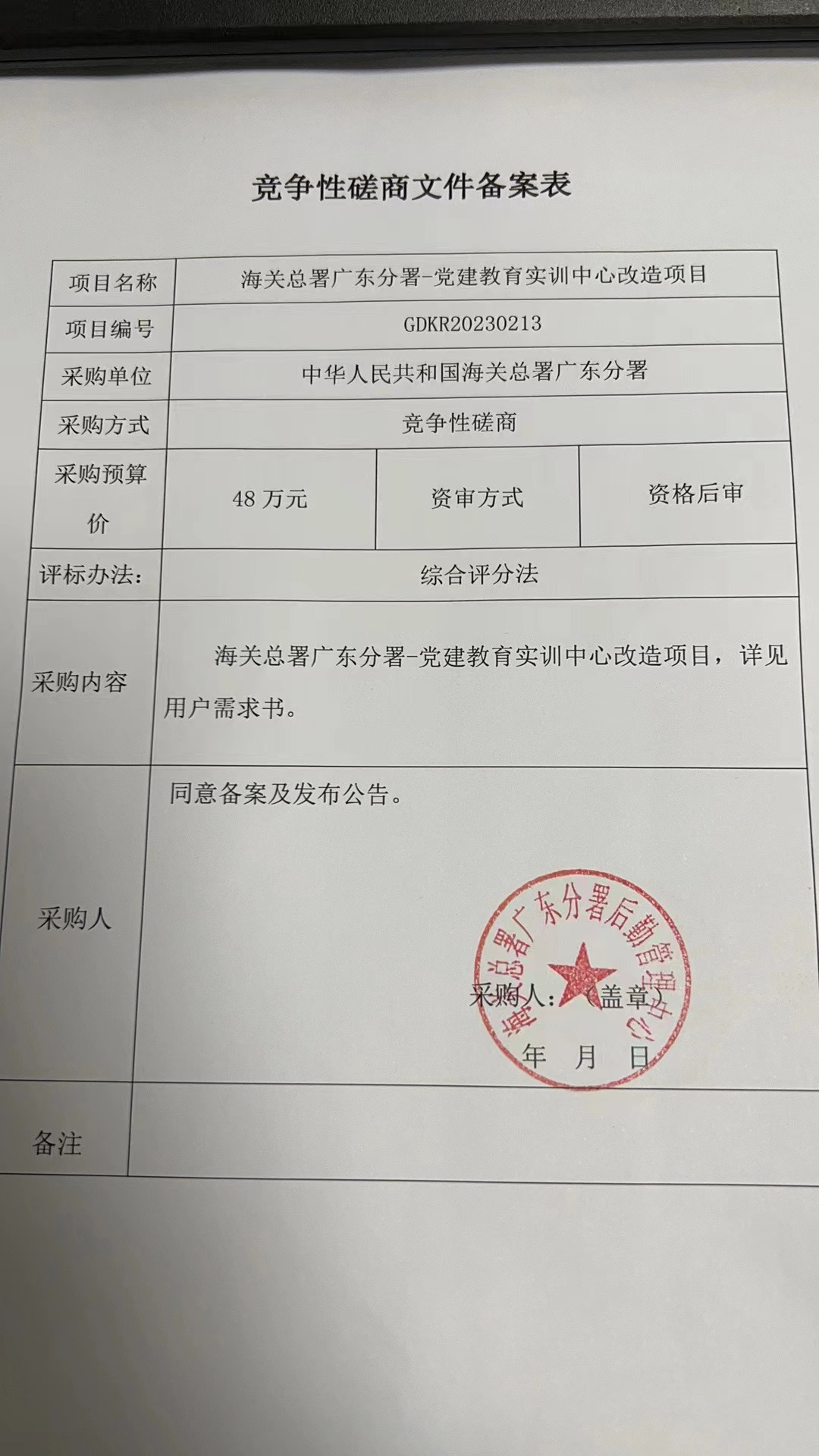 廣東科瑞工程管理有限公司(以下簡稱“采購代理機(jī)構(gòu)” )受中華人民共和國海關(guān)總署廣東分署(以下簡稱“采購人”)的委托,對海關(guān)總署廣東分署-黨建教育實訓(xùn)中心改造項目進(jìn)行競爭性磋商采購,歡迎符合資格條件的供應(yīng)商投標(biāo)。