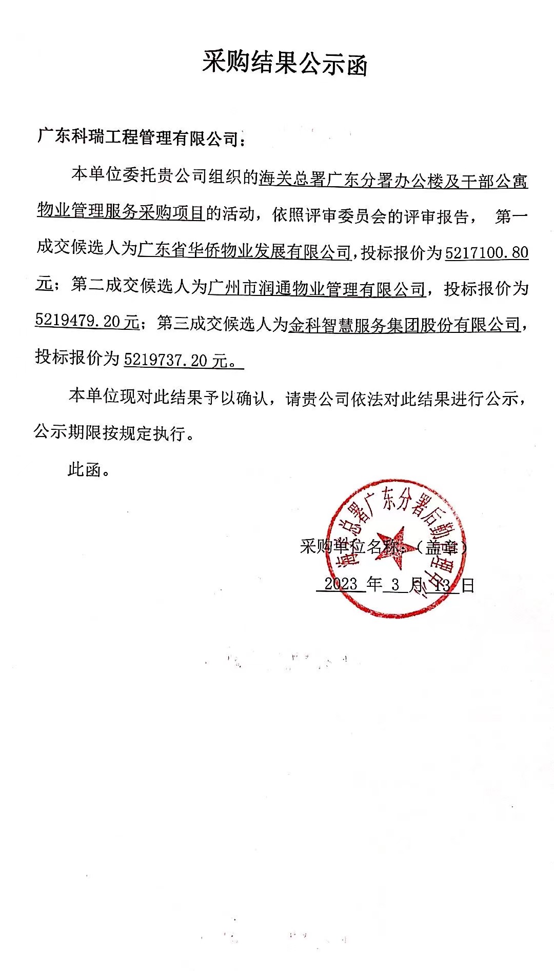 廣東科瑞工程管理有限公司受中華人民共和國海關(guān)總署廣東分署的委托,于2023年2月就海關(guān)總署廣東分署辦公樓及干部公寓物業(yè)管理服務(wù)采購項(xiàng)目進(jìn)行公開招標(biāo)采購?,F(xiàn)就本次采購的中標(biāo)(成交)結(jié)果公告如下: