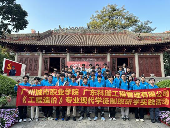 在2024年12月6日的午后,廣州城市職業(yè)學(xué)院與廣東科瑞工程管理有限公司攜手打造的科瑞工程造價產(chǎn)業(yè)學(xué)院23-24級現(xiàn)代學(xué)徒制(工程造價)班的紅色研學(xué)之旅如期而至。此次旅程的主題為“傳承紅色基因、鑄就青春夢想”,旨在讓學(xué)子們在親身體驗中感受紅色文化的熏陶,汲取前行的動力。